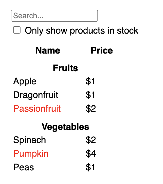 function ProductCategoryRow({ category }) { return ( <tr> <th colSpan="2"> {category} </th> </tr> ); } function ProductRow({ product }) { const name = product.stocked ? product.name : <span style={{ color: 'red' }}> {product.name} </span>; return ( <tr> <td>{name}</td> <td>{product.price}</td> </tr> ); } function ProductTable({ products }) { const rows = []; let lastCategory = null; products.forEach((product) => { if (product.category !== lastCategory) { rows.push( <ProductCategoryRow category={product.category} key={product.category} /> ); } rows.push( <ProductRow product={product} key={product.name} /> ); lastCategory = product.category; }); return ( <table> <thead> <tr> <th>Nom</th> <th>Prix</th> </tr> </thead> <tbody>{rows}</tbody> </table> ); } function SearchBar() { return ( <form> <input type="text" placeholder="Recherche..." /> <label> <input type="checkbox" /> {' '} N’afficher que les produits en stock </label> </form> ); } function FilterableProductTable({ products }) { return ( <div> <SearchBar /> <ProductTable products={products} /> </div> ); } const PRODUCTS = [ { category: "Fruits", price: "1 €", stocked: true, name: "Pomme" }, { category: "Fruits", price: "1 €", stocked: true, name: "Fruit du dragon" }, { category: "Fruits", price: "2 €", stocked: false, name: "Fruit de la passion" }, { category: "Légumes", price: "2 €", stocked: true, name: "Épinard" }, { category: "Légumes", price: "4 €", stocked: false, name: "Citrouille" }, { category: "Légumes", price: "1 €", stocked: true, name: "Petits pois" } ]; export default function App() { return <FilterableProductTable products={PRODUCTS} />; }